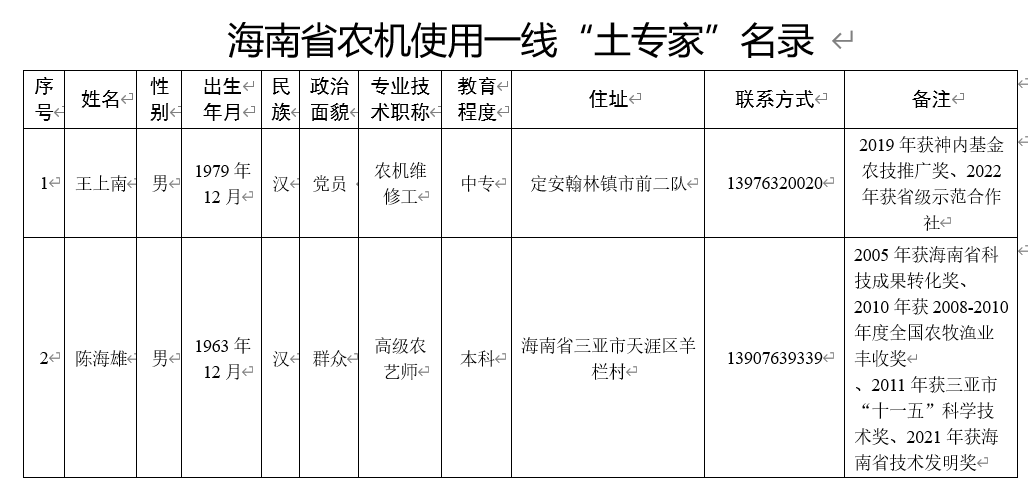 海南省农机使用一线“土专家”人选公示