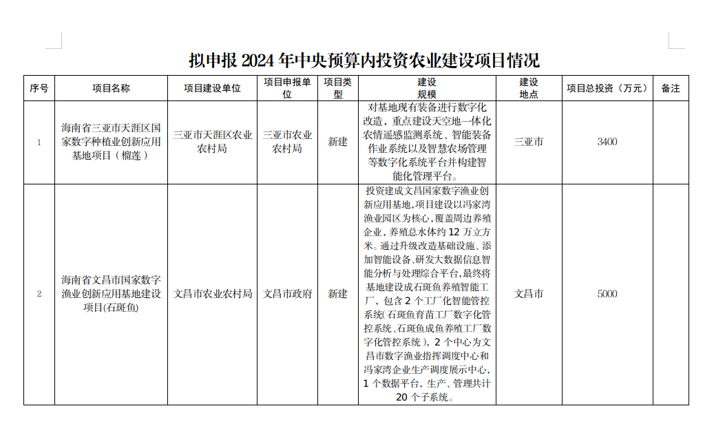 海南省农业农村厅关于三亚市、文昌市等二个市县2024年中央预算内投资农业建设项目的公示