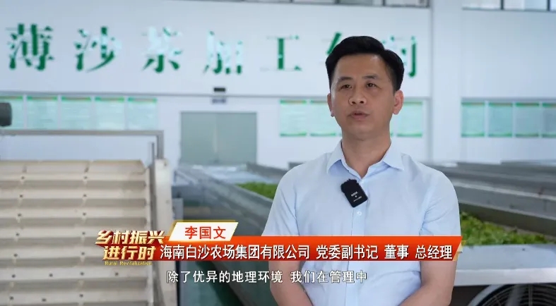 海南白沙农场集团有限公司 党委副书记 董事 总经理 李国文“薄沙茶”坚持生态、有机、健康、天然,严选新鲜嫩绿的“一芽两叶”,采用先进的自动化生产线进行茶叶制作,从萎凋、杀青、揉捻、烘干到包装,每一个环节都经过精准化的把控。
