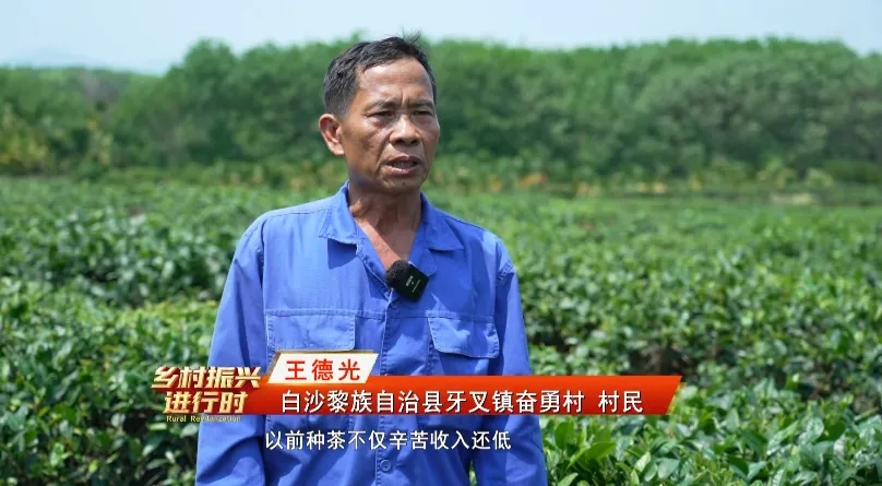 白沙黎族自治县牙叉镇奋勇村村民王德光自从白沙农场集团进行专门指导种植,还保底7块钱一公斤收购,有时候采摘一个上午就有五六百元,我今年要再扩种5亩茶叶。